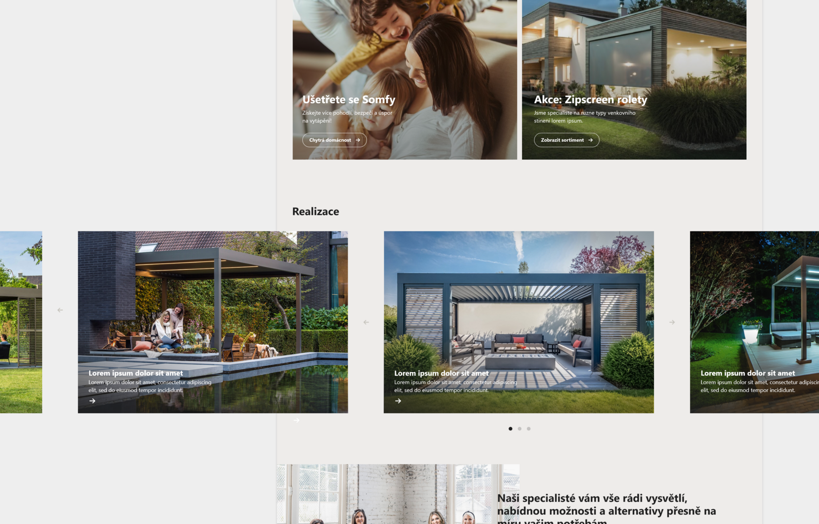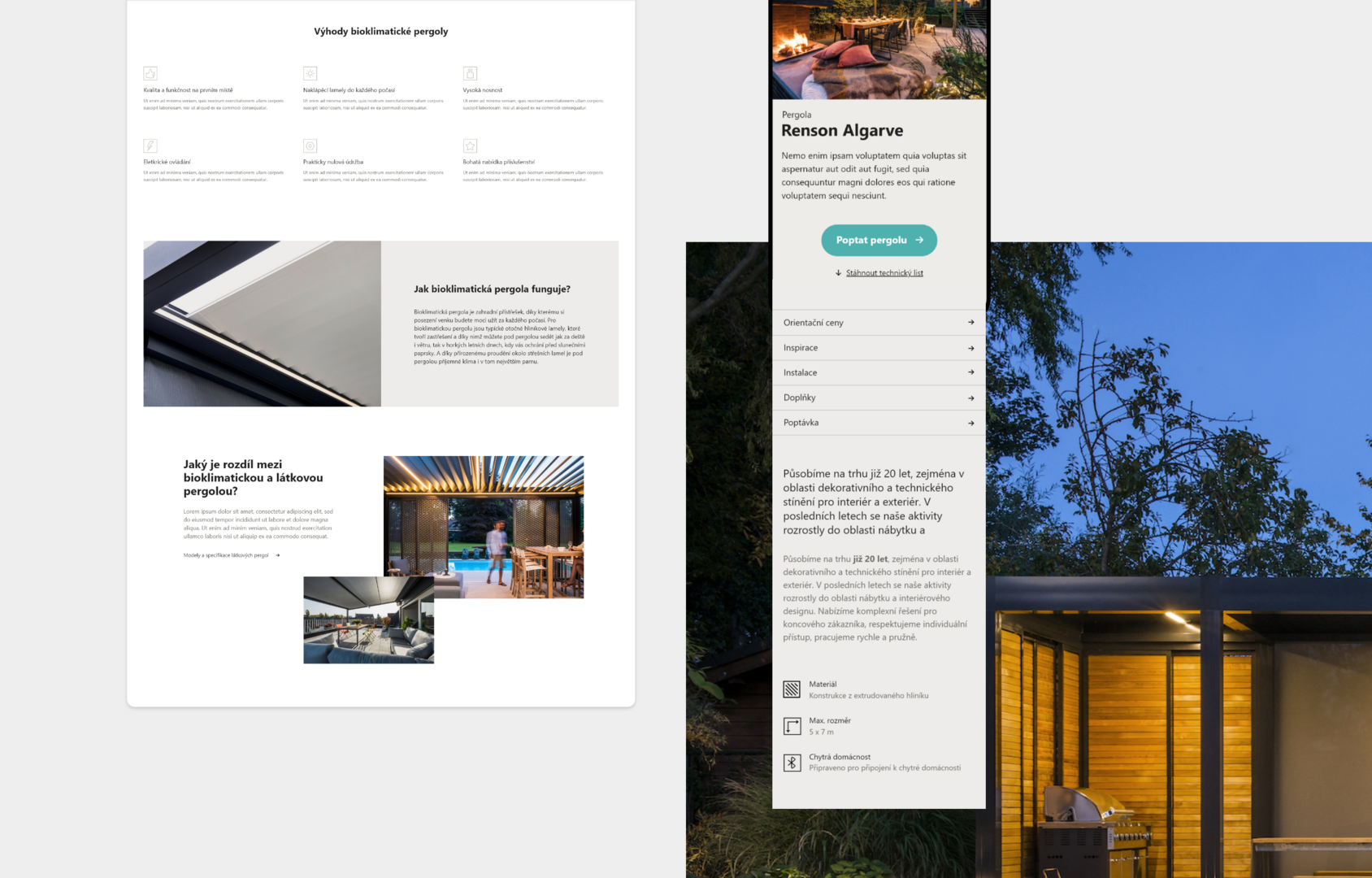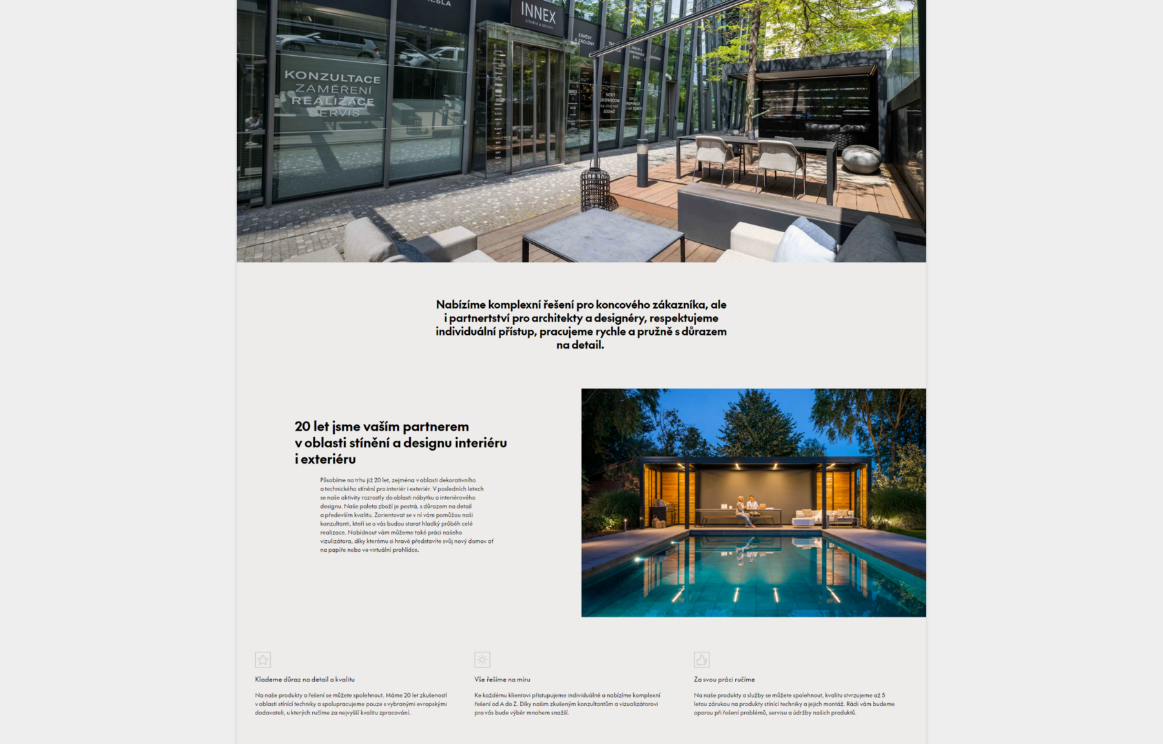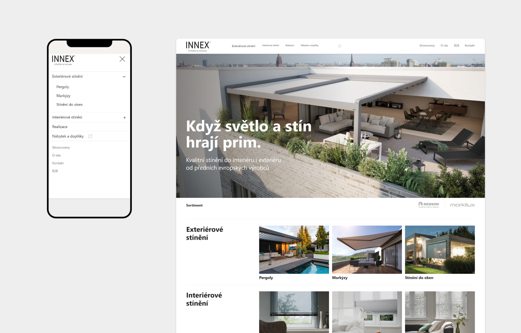 Cílem projektu bylo vytvořit designově minimalistické řešení pro prezentaci produktů stínící techniky, exteriérového i interiérového nábytku a e-shopu s doplňky s důrazem na kvalitní imagové a produktové fotografie. Stínící technika je doplněna o funkcionalitu Kalkulátoru, který na základě zvolených rozměrů přiblíží uživateli orientační cenu produktu.