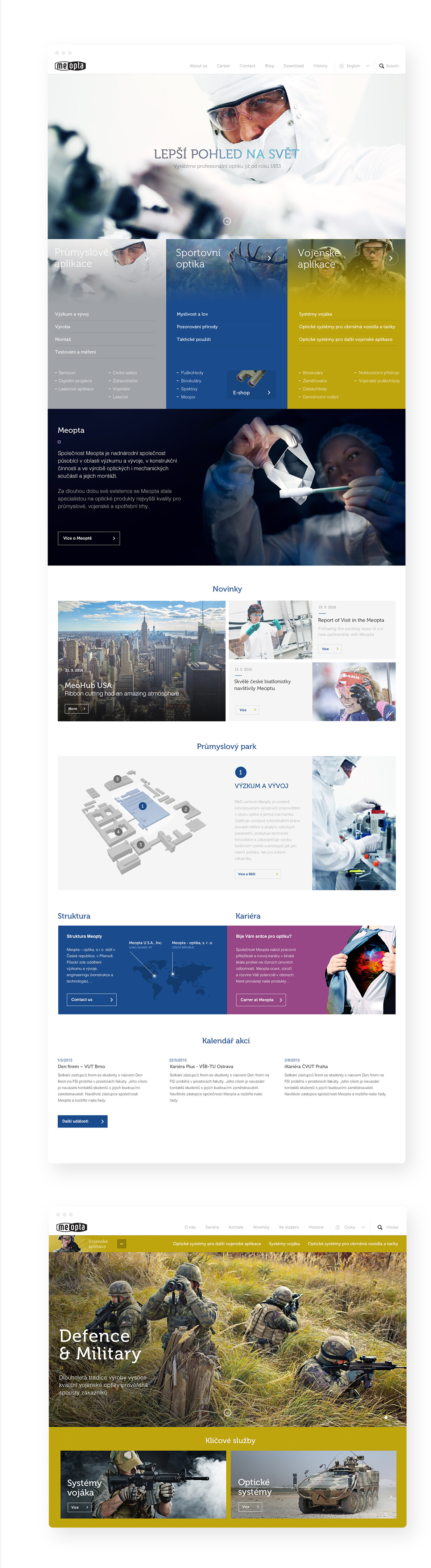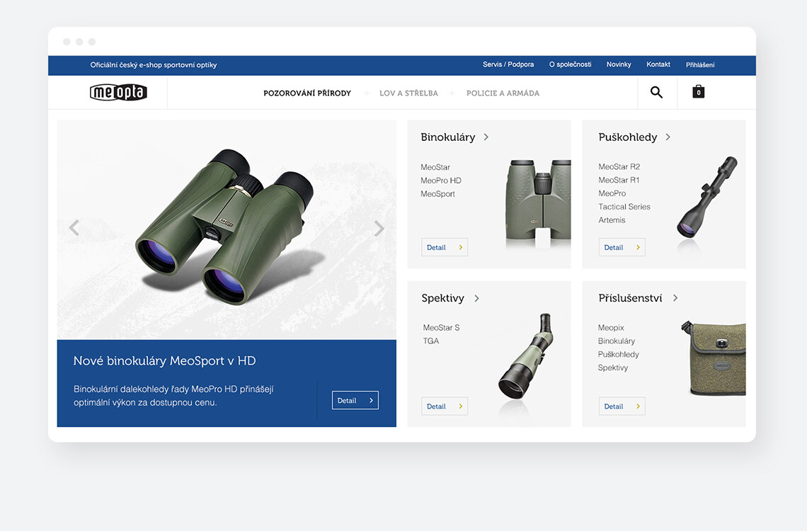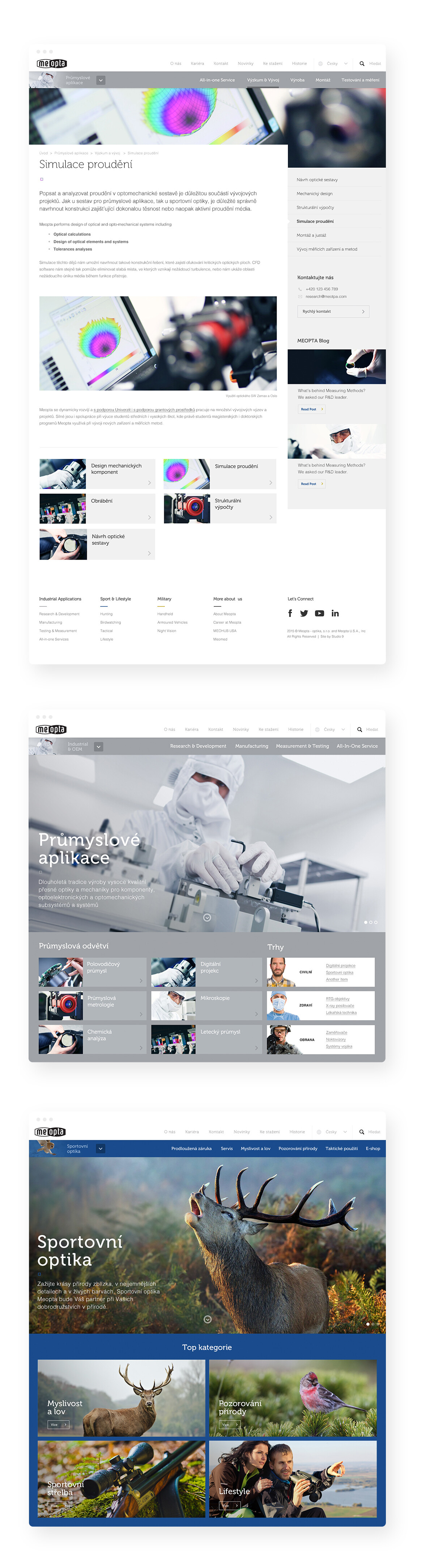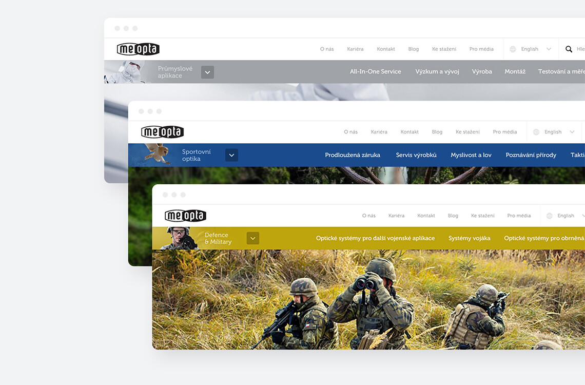 Firma Meopta se ve výrobě optických produktů řadí mezi specialisty na trhu, a to v oblasti průmyslu, vojenství a sportu. Cílem bylo ukázat její pravou tvář prostřednictvím vlastní online prezentace a zároveň propojit jednotlivé oblasti působnosti pod jedinou značku. Při tvorbě webu a řešení jeho funkčnosti jsme museli vzít v úvahu diverzifikovanost cílové skupiny i řadu odlišných referencí. V závěru však vznikla srozumitelná struktura zasazená do čistého designu.