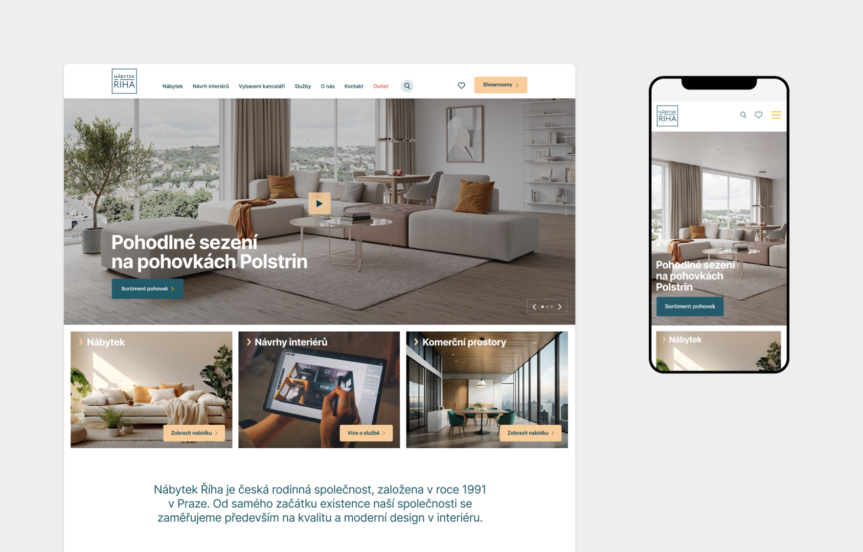 Prezentační web, který představí Nábytek Říha jako rodinnou firmu schopnou dodat zákazníkovi nemožné. Zvolili jsme jednoduchý design vycházející z barev dodaného vizuálu. Jedná se o jemný design s důrazem na produkty, které jsou v tomto případě zásadní.